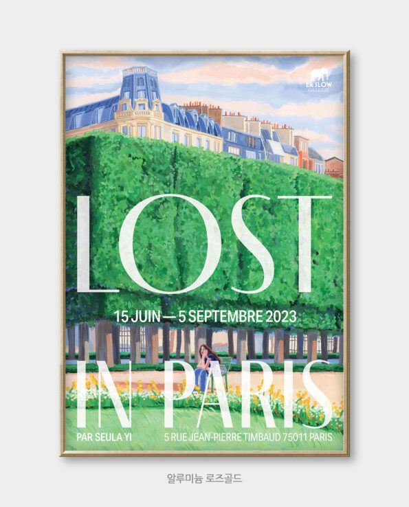 2023년 6월 15일부터 9월 5일까지 프랑스 파리에서 열린 이슬아 작가의 전시 포스터입니다. 포스터의 원화 *’Lost in Paris’ 작품은 전시의 메인 작품으로 룩상부르 공원에 앉아있는 인물을 통해 파리의 모습을 표현하고 있습니다. 원화가 그려진 아르쉬(Arches)의 질감과 색상 재현에 중점을 두고 제작했습니다.
